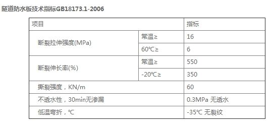 優(yōu)良的防滲性;高阻隔性;高抗穿刺性;無化學(xué)污染;耐酸堿及多種化學(xué)物質(zhì);優(yōu)良的延伸率及耐磨性;尺寸穩(wěn)定性好;粘接性好;施工方便。 隧道防水板一般分為HDPE防水板和EVA防水板,現(xiàn)在也有復(fù)合防水板。
